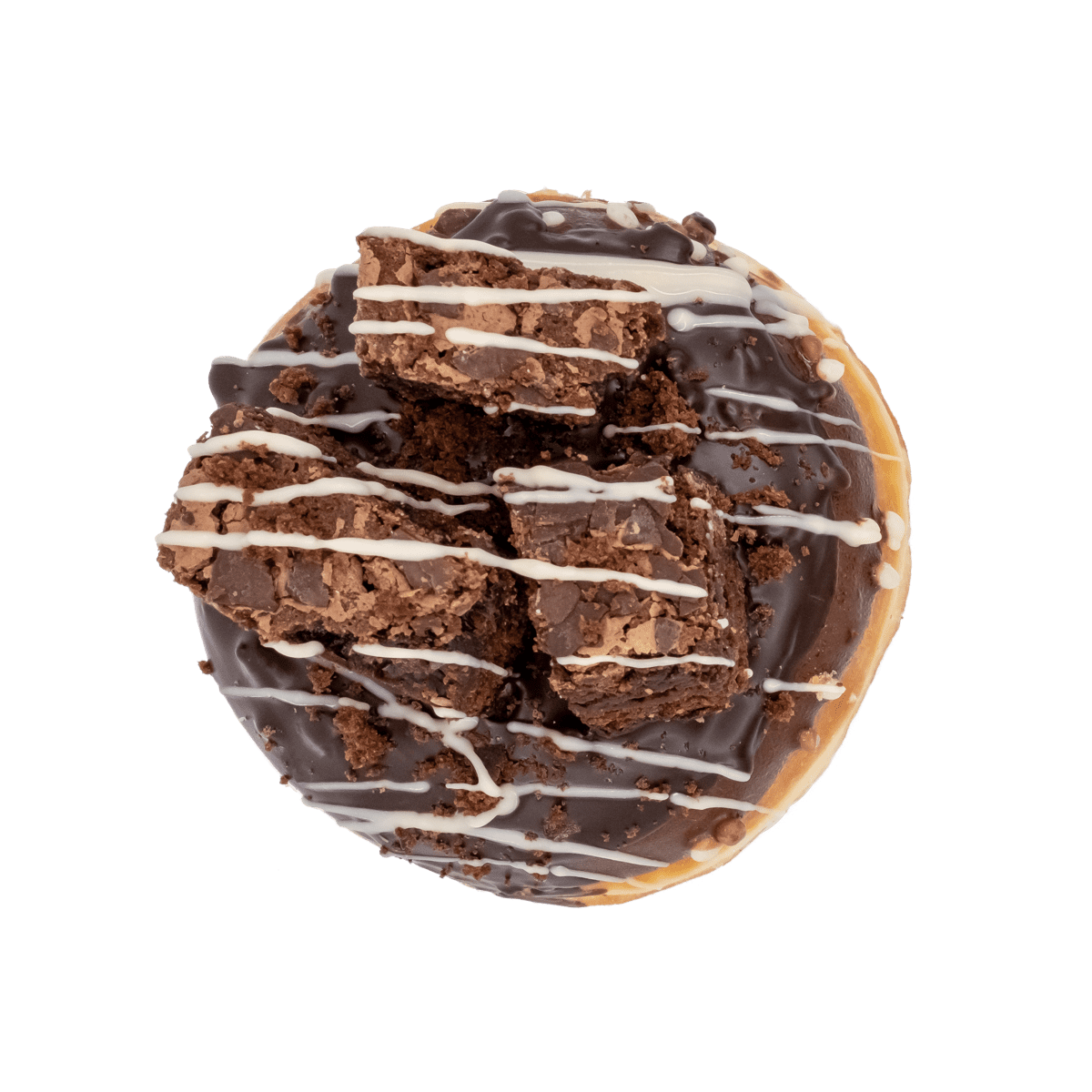 Füllung: Dunkle Schokolade | Glasur: Dunkle Schokolade | Sauce: weiße Schokolade | Topping: Brownie, Brownie-Crumbs