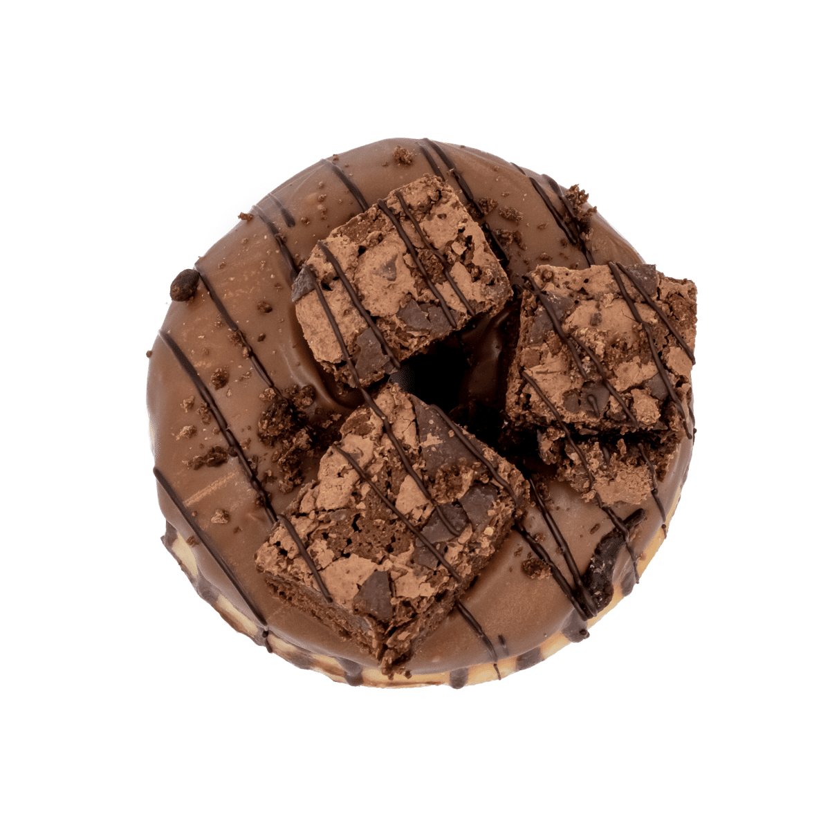 Füllung: Dunkle Schokolade | Glasur: Dunkle Schokolade | Sauce: weiße Schokolade | Topping: Brownie, Brownie-Crumbs