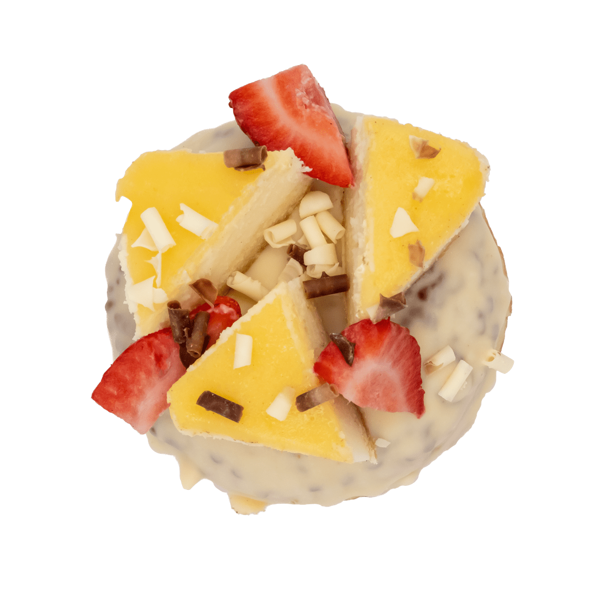 Füllung: Boston-Creme | Glasur: weiße Schokolade | Sauce: weiße Schokolade | Topping: Erdbeere, Schokoladenraspeln, Käsekuchen, Weiße Schokoladenraspeln