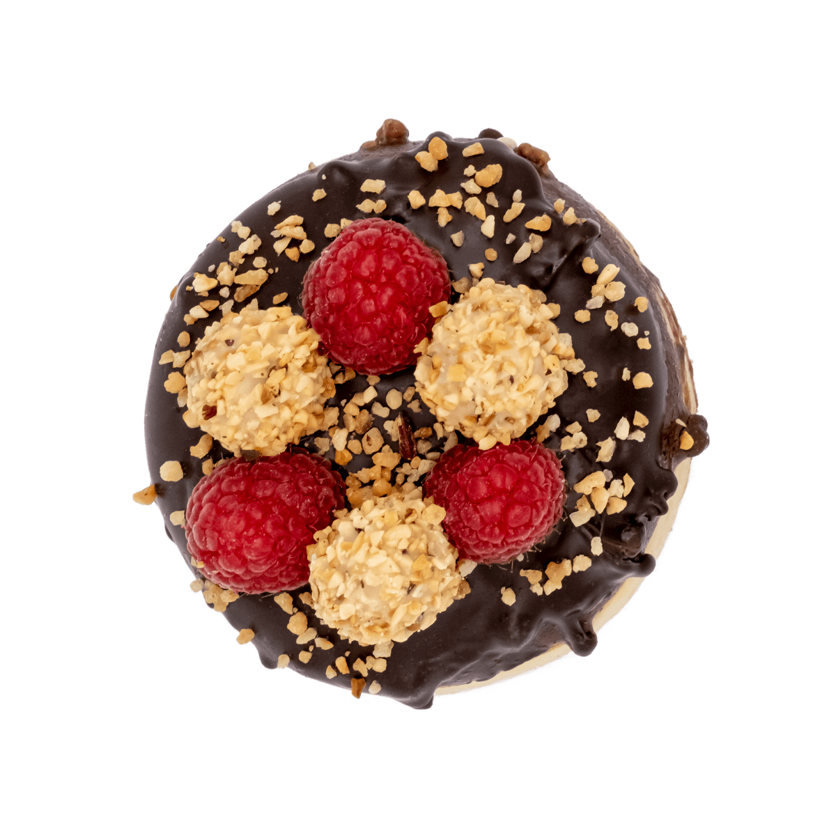 Füllung: Boston-Creme | Glasur: Dunkle Schokolade | Sauce: weiße Schokolade | Topping: Himbeeren, Schokoladenraspeln, GiOTTO, Weiße Schokoladenraspeln
