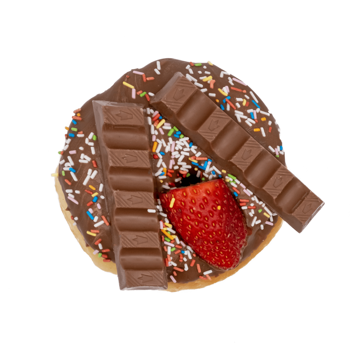 Füllung: keine | Glasur: Dunkle Schokolade | Sauce: weiße Schokolade | Topping: Kinderriegel, bunte Streusel, Erdbeere